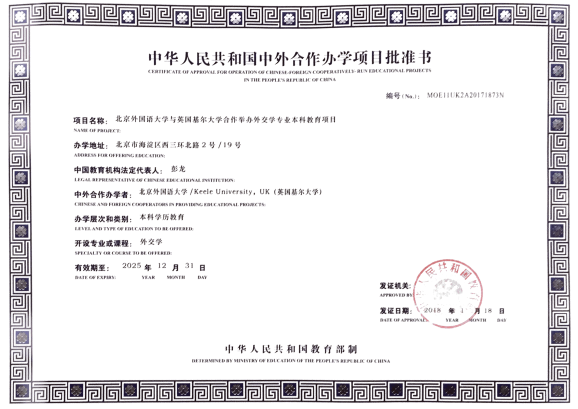 公司与英国基尔大学(Keele University, UK)共同申请的外交学本科教育项目日前已获教育部批准(编号:MOE11UK2A20171873N),计划于2018年开始招生。这是公司同英国大学的首个本科中外合作办学项目,也是国内此类合作办学性质的首个外交学专业项目。