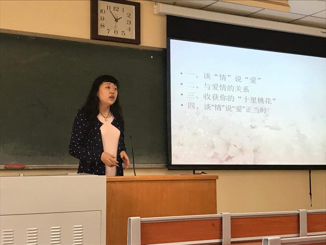 讲座分四个主题:谈“情”说“爱”;与爱情的关系;收获你的“十里桃花”;谈“情“说”爱“正当时。分别向我们介绍了爱情产生的条件,发展的过程,给我们生活带来的益处,以及如何收获自己的爱情,正确对待爱情的态度。