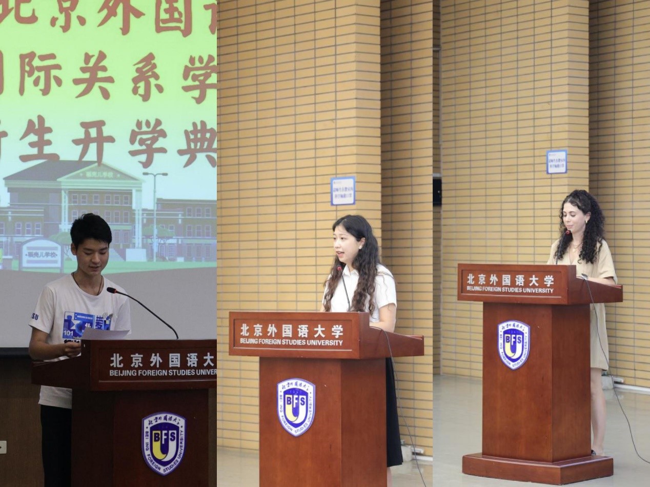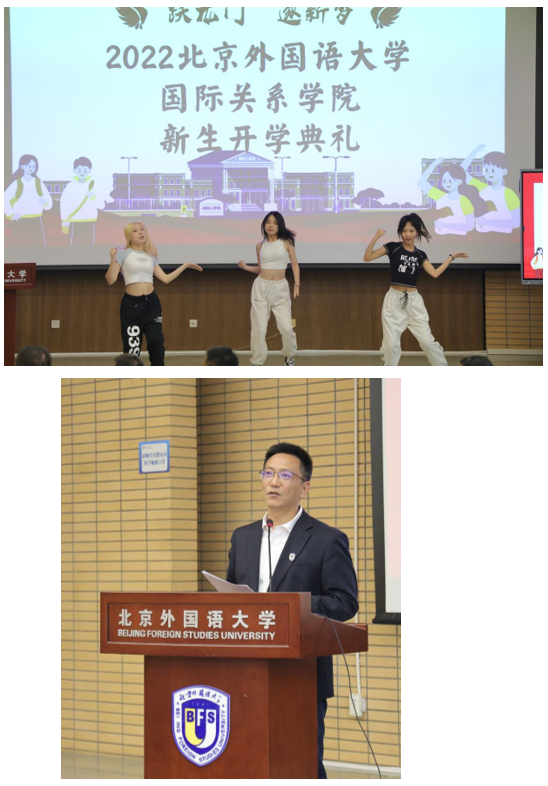 接下来,22级外交学(中外合作办学)专业的彭李思瀚同学作为新生代表发言。彭李思瀚同学首先表达了对提供帮助的老师、学长学姐们的感谢,并表达了对于来到北外的欣喜、对于老员工活的憧憬,也立志以诸多优秀员工为榜样,号召同学们对自己未来的学习与发展提出更高期待与要求。