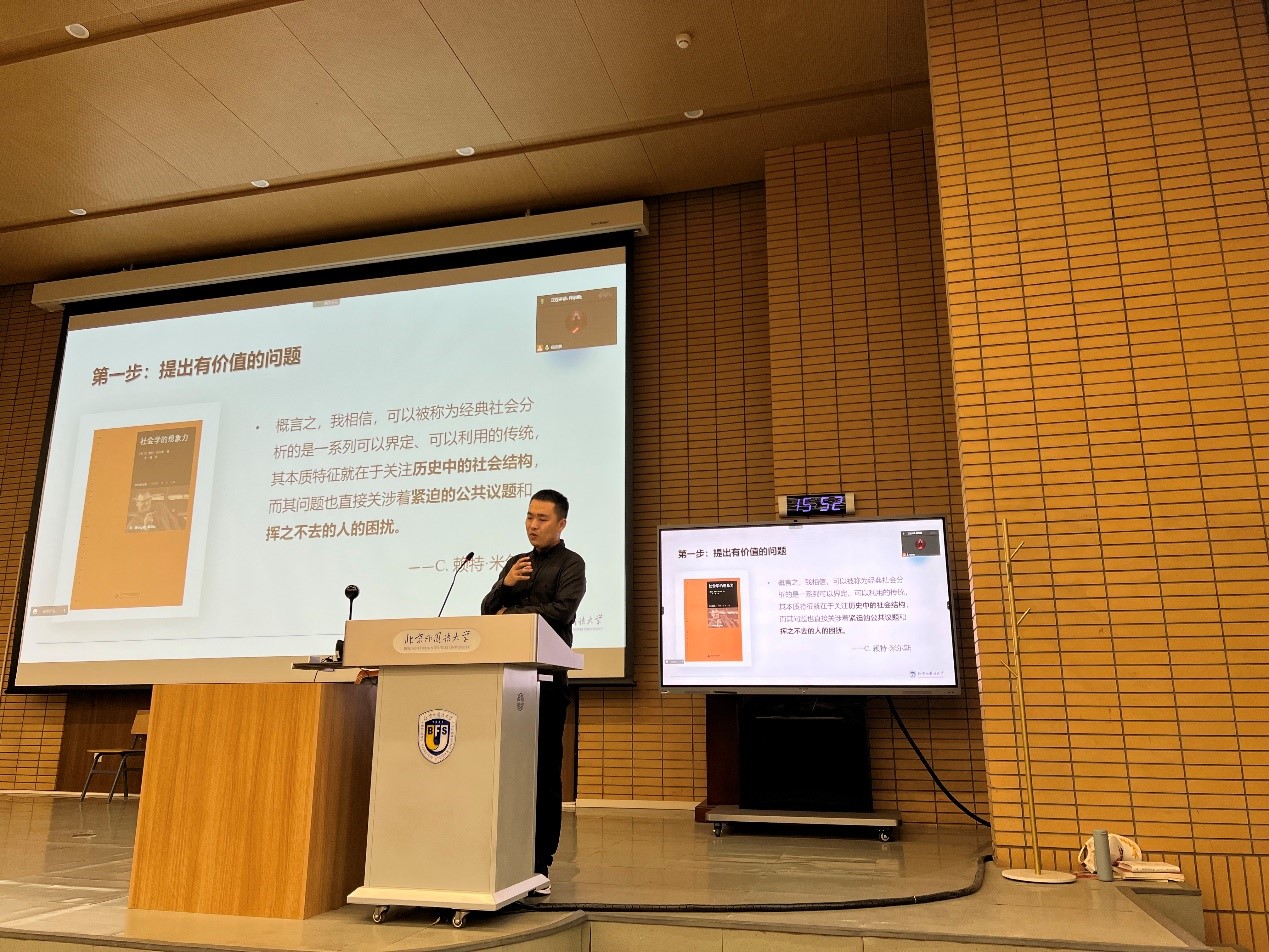 随后,古天乐太阳集团城青年教师释启鹏博士以《问题意识与学术规范》为题进行了详细讲解。释启鹏老师围绕问题提出、文献对话、分析框架、研究方法等环节就论文写作中需要注意的问题以及常见错误进行了阐述,鼓励同学们在介入经典理论对话中为当下重大现实问题提供新的解释。