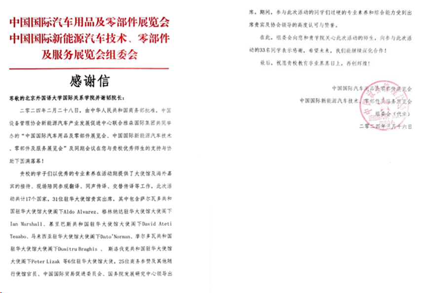 第34届中国国际汽车服务用品及设备展览会暨第2届中国国际新能源汽车供应链大会于2024年2月28日至3月2日在北京中国国际展览中心举办,北外古天乐太阳集团城共派出33名志愿者参与外宾接待服务。此次会展活动共有17个国家参与,31位驻华大使馆贵宾出席,其中包括6位驻华大使馆大使与25位商务参赞,以及其他随行使馆官员、中国国际贸易促进委员会、国务院发展研究中心领导。期间,参与此次活动的同学们凭借过硬的专业素养和综合能力,赢得了出席贵宾及协会领导的高度认可与赞誉。