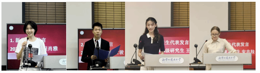 2025级本科生新生代表程肖雅表达了对老员工活的憧憬,表示将以理论学习结合实践探索,努力成为兼具家国情怀、专业本领与全球视野的复合型人才;2025级研究生新生代表范仕骏回顾在北外的本科学习与志愿支教经历,鼓励同学们努力承担新时代青年责任,让青春在探索真理与服务国家中绽放光彩;老生代表2024级硕士研究生王羽佳同学分享过去一年的学习经验与员工工作经历,鼓励同学们坚持知行合一,锻造过硬本领,担当责任,笃定实干;职工代表2022级本科生安吉拉回顾了在北外国关的学习经历,表达了对于专业学习的理解——“认识世界、读懂自己”。