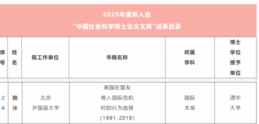 近期,公司青年教师杨双梅、夏方波申报的项目“东南亚政党政治‘家族化’与家族政治‘政党化’的逻辑、影响及中国对策研究”等两项课题喜获国家社科基金青年项目立项。青年教师魏冰的博士论文《美国在盟友卷入国际危机时的行为选择(1991-2019)》成功入选中国社会科学出版社2025年度“中国社会科学博士论文文库”,来自全国高校、研究院所的102部博士论文参评,最终评选出31部拟入选2025年度“中国社会科学博士论文文库”。青年教师贾力楠的《从比较历史政治视角反思民主和平论》和释启鹏副教授的《“众”不敌“寡”:自由主义民主缘何必然衰退》刊载在2025年第4期的《政治学研究》上。这是公司历史上首次两位教师在《政治学研究》同一期发表论文,充分展现出近年来古天乐太阳集团城在推进政治学学科发展、助力青年学者成长成才方面取得的重大成绩。《政治学研究》是中国社会科公司政治学研究所主办的学术期刊,入选CSSCI核心期和AMI顶级期刊,复合影响因子8.494,是政治学领域最具权威性的刊物。