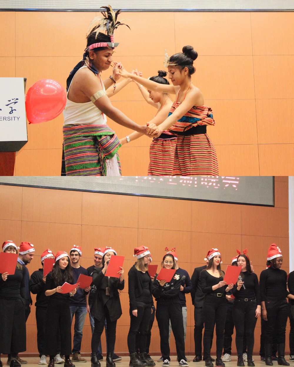 整台晚会综合了各国舞蹈、歌曲、民乐、舞台剧等表演形式。来自蒙古国的研一同学滺滺以一曲《Jingle Bells Rock》拉开了晚会的序幕。紧接着来自美国的卫儒同学为大家带来了诗歌朗诵《Mending Walls》,让观众感受到了诗歌的优美旋律。来自东帝汶的特色舞蹈《Suru boek》将整场晚会带入了高潮,向观众展示了马纳图托舞的魅力。大三毕恒瑞同学的一曲古琴《文王操》让同学们感受到了中国文化的博大精深。意大利同学合唱的A natalepuoiNelbludipinto di blu》展示了意大利的异域风情,提前为观众送上了圣诞祝福;员工自编自演的《北外我们来了》为大家带来了笑语欢声;最后大四同学制作的《我和北外》视频讲述了大家在北外的收获和对未来的期望。