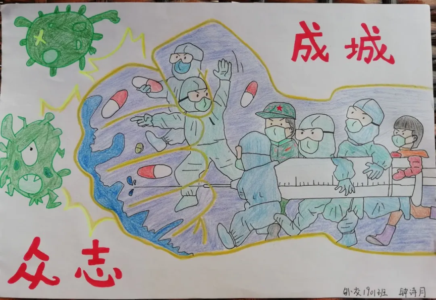 这是来自1901班的钟诗月同学有关抗击疫情、众志成城的手抄报。她解释说:这次抗击新型冠状病毒肺炎疫情是一场没有硝烟的战争。作为北外国关的一员,我用自己的方式表达着对抗击疫情的支持。这幅手绘漫画中,穿着防护服的是战斗在一线的医护人员们,身穿迷彩服的是解放军,衣着打扮像员工一样的是志愿者们。漫画中的人象征着全国人民,他们坚强有力,能够一拳将病毒击垮。这幅漫画代表着全国人民战胜病毒的信心,也代表着像我这样的志愿者对抗击疫情的支持。