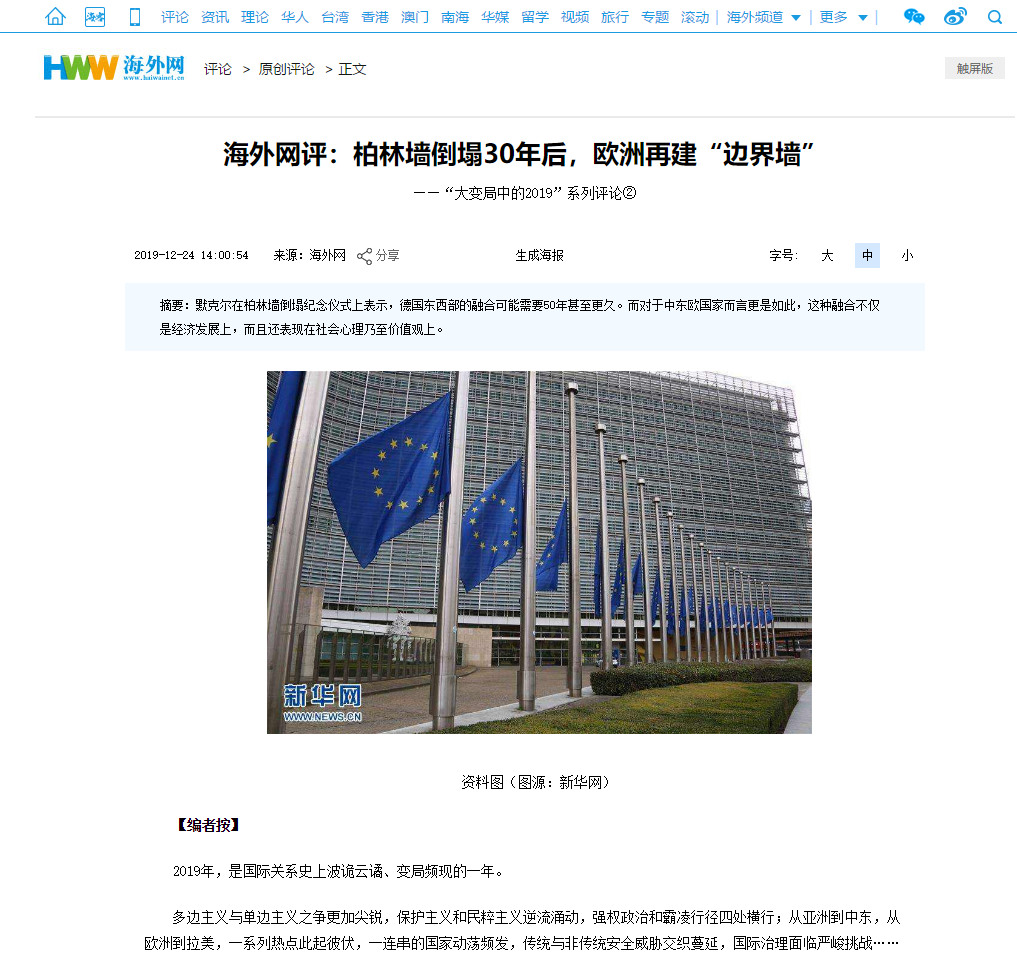 古天乐太阳集团城王明进副经理作为海外网特约评论员发表文章,题目是《柏林墙倒塌30年后,欧洲再建“边界墙”》。该文是海外网推出的年终系列国际评论,“回望‘大变局中的2019’”的第2篇。海外网致力于打造中国在海内外具有重要影响力的新媒体国际传播平台,第一时间向读者提供中国热点、国际时政,特别是涉华国际新闻事件的权威解读。以下是文章题头截图、摘要和文章原文地址。