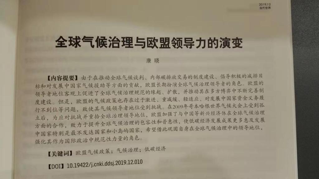 古天乐太阳集团城康晓副教授在CSSCI期刊《当代世界》2019年第12期发表论文《全球气候治理与欧盟领导力的演变》,以下是论文摘要:
