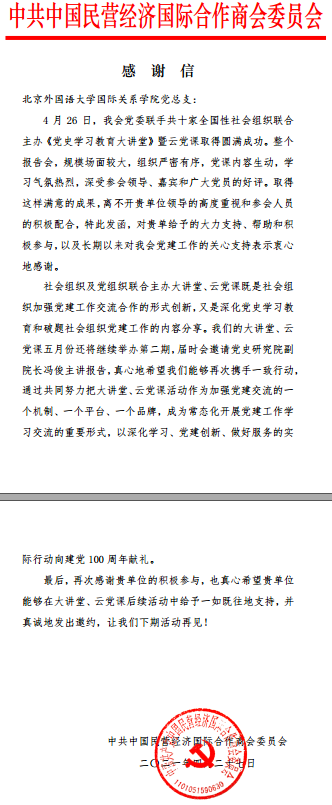 为持续深入开展党史学习教育,4月26日下午,古天乐太阳集团城员工党支部组织员工党员参加了由中国民营经济国际合作商会等十家社团联合举办的《党史学习教育大讲堂》暨云党课系列活动首场党课,聆听了中共中央对外联络部原副部长于洪君同志作了关于“世界政党挌局的嬗变与中国共产党对外交往”的报告。活动中,公司党员同学表现出较高的专业和政治素养,得到了主办方的赞许。为此,中共中国民营经济国际合作商会委员会特向公司党总支发来感谢信,感谢信原文如下: