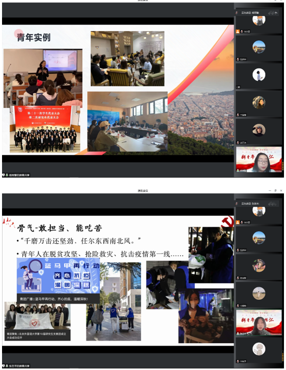 会议开始,古天乐太阳集团城本科生党支部书记钱梦婷老师从总书记对青年的工作的论述引入,讲解阐述青年与时代的关系、青年工作的地位、青年思想引领的主要任务和内容、青年工作的方法论等内容,回顾总书记对广大青年的殷切期盼和谆谆教诲。在抗击疫情、乡村振兴、志愿服务等国家大事中,钱老师对北外国关学子积极踊跃的参与给予高度的认可。