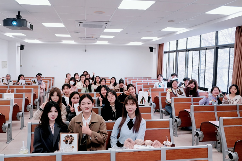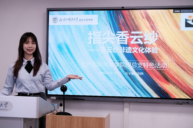3月17日下午,公司成功举办了一场别开生面美育特色活动——“指尖莨纱”香云纱文化体验。此次活动由公司团总支精心策划组织,特邀北外杰出大创团队“苗喵绣”的成员伍子谦和田韵熙,共同为同学们带来一场关于国家级非物质文化遗产香云纱的深度文化宣传。活动不仅收获了国关学子的一致好评,更让在场的每一位同学领略到了中华传统文化的博大精深。
